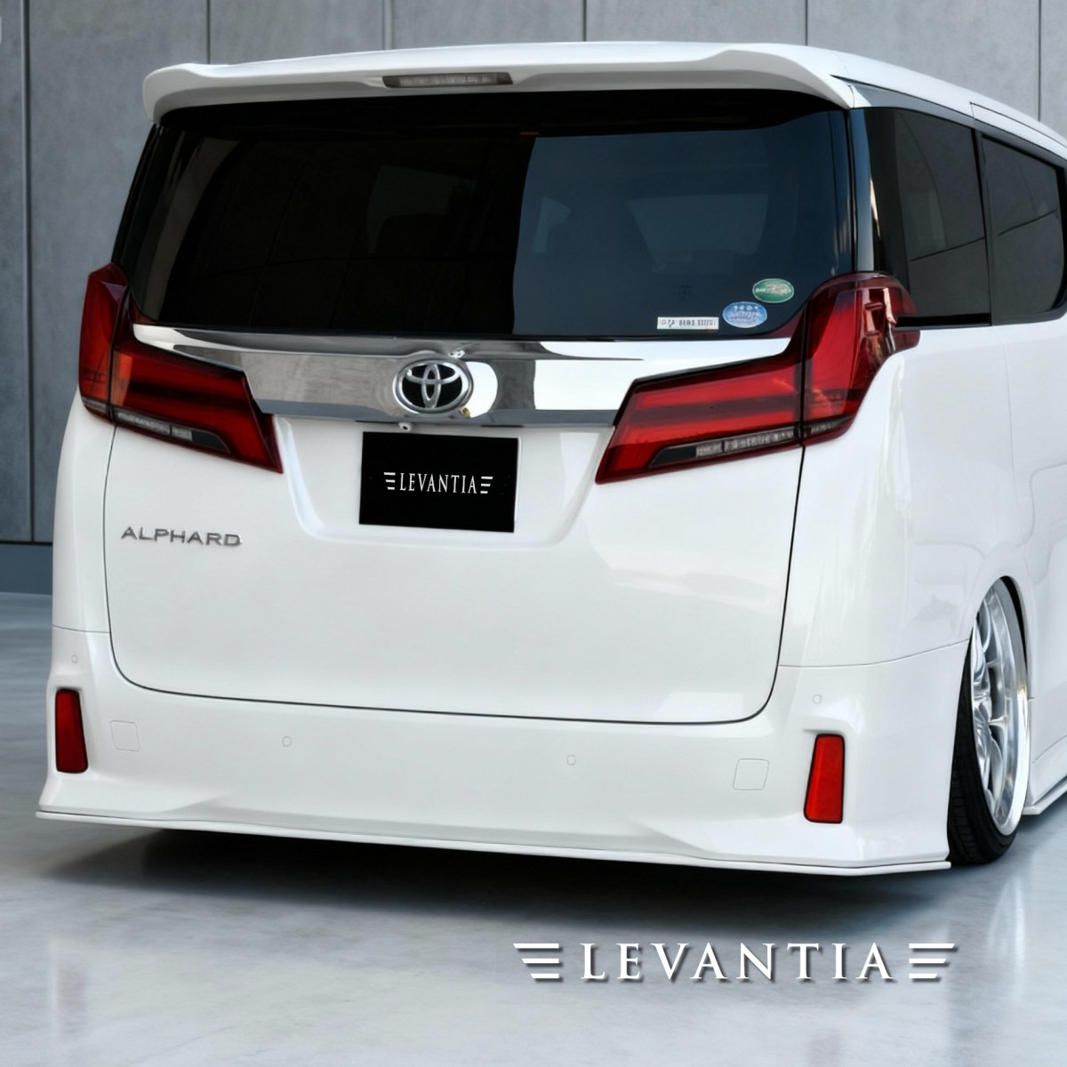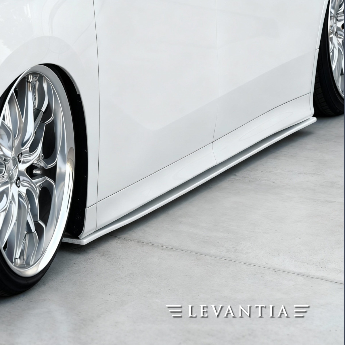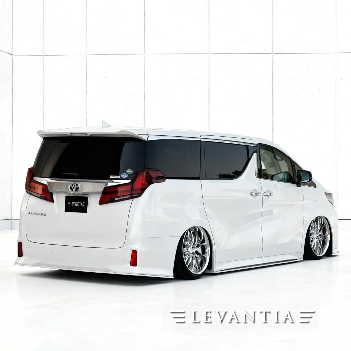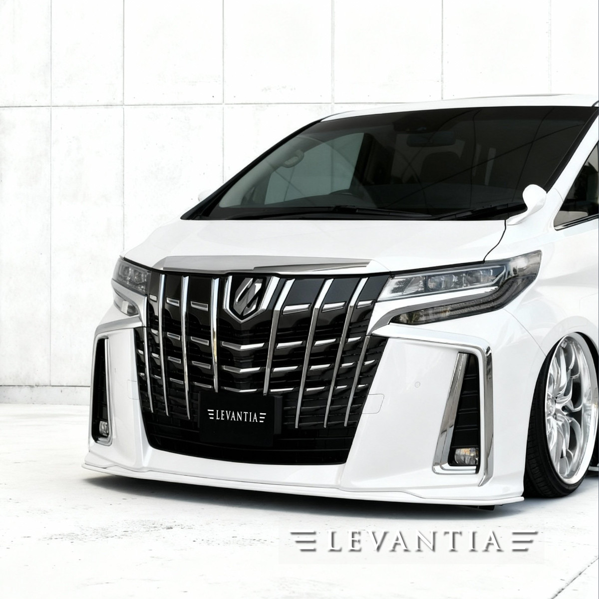 完成されたアルファードに対し、LEVANTIAは「足す」のではなく「整える」ことで応えた。縦格子グリルの迫力を活かしつつ、薄く鋭いリップと縦のメッキが深い陰影を刻む。視線は自然と路面へ導かれ、低重心な佇まいを強調。側面は反射のラインを揃え、白と黒のコントラストを端正に描き出す。リアは下端をわずかに延伸し、車格を損なうことなく路面へ沈み込む姿勢を表現した。