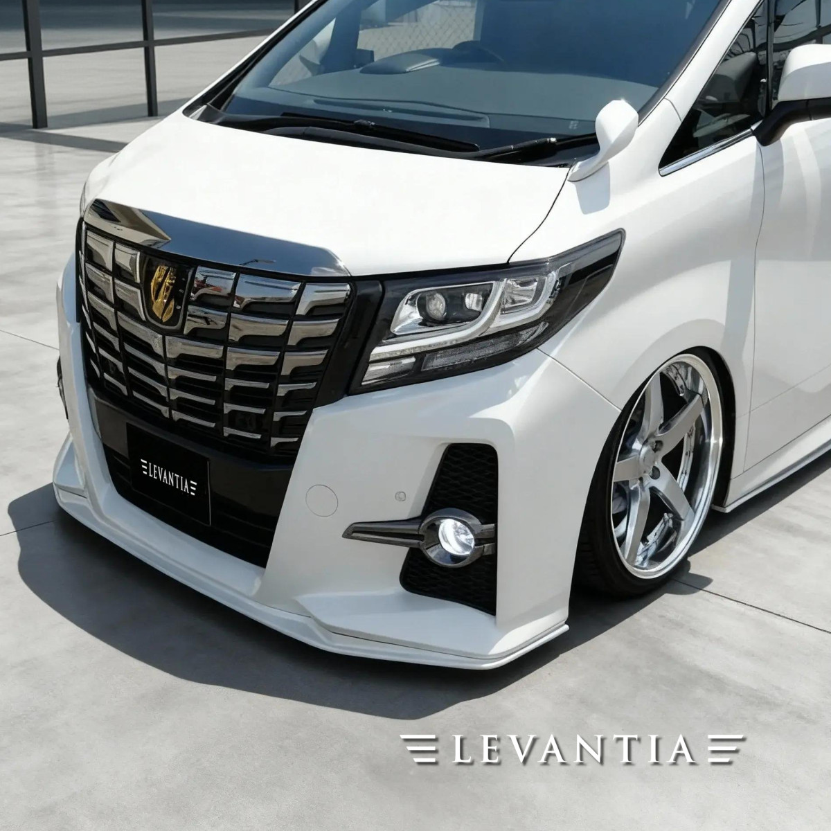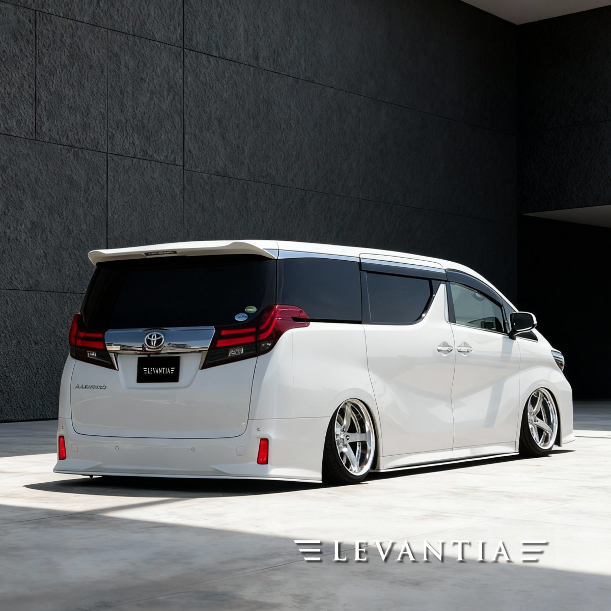 LEVANTIAはアルファードの純正美を尊重し、その奥に眠る品格と低重心だけを呼び覚ます。フロントフラップが刻む深い陰影はグリルの存在感を際立たせ、サイドを貫く端正なラインは、ホイールの輝きを一層引き立てる「締まった車格」を創出。リアが醸し出す重厚な余韻は、去り行く後ろ姿に静かな圧を残す。