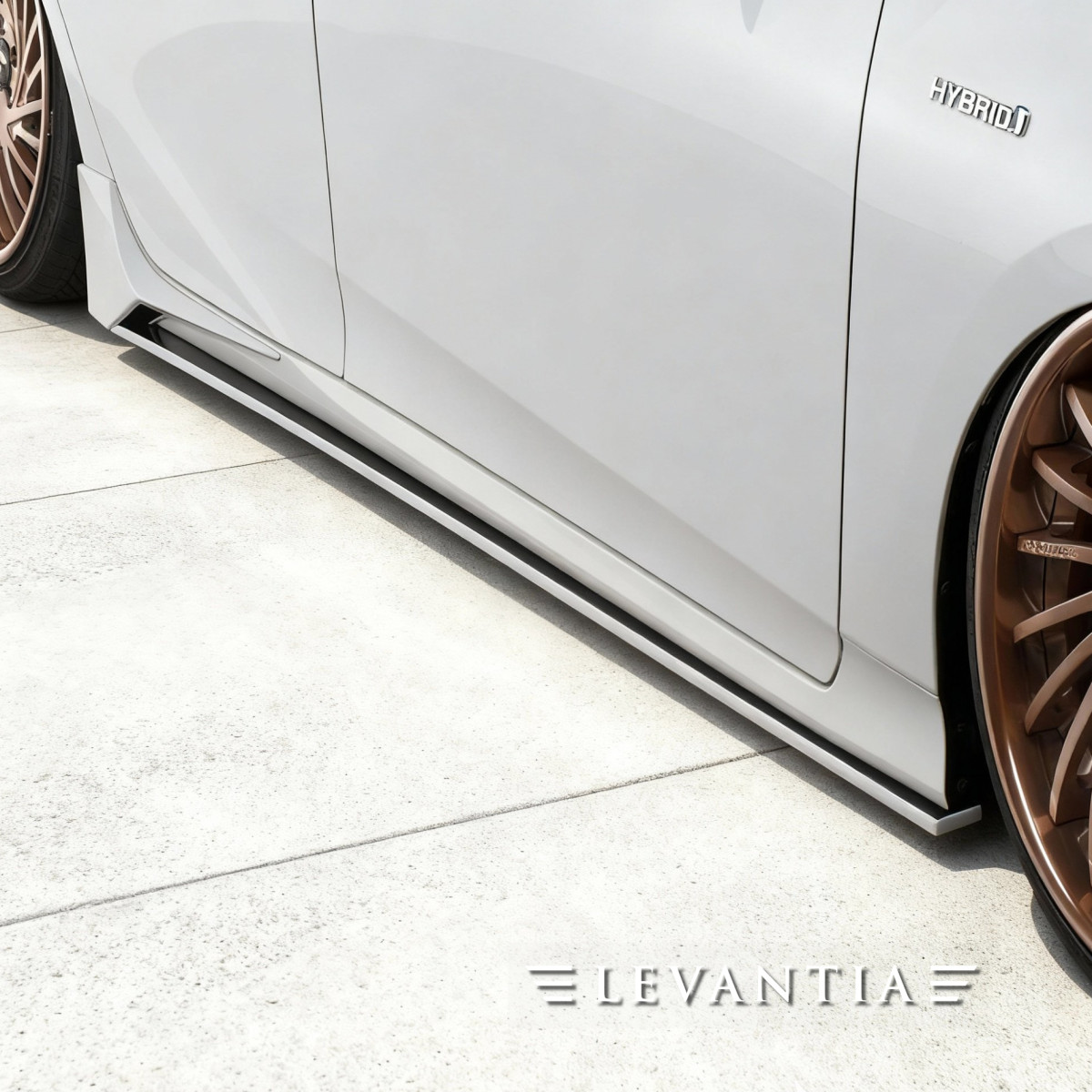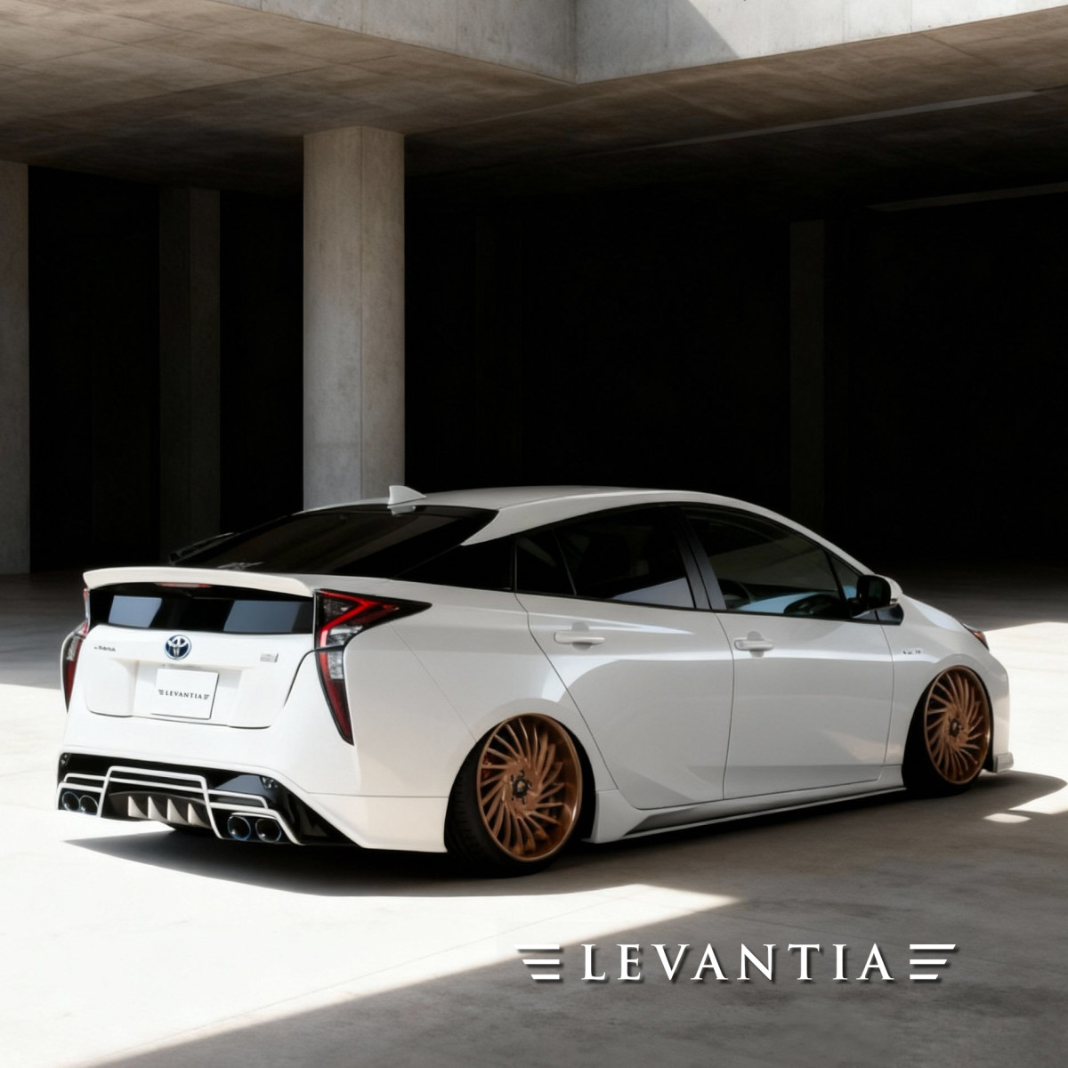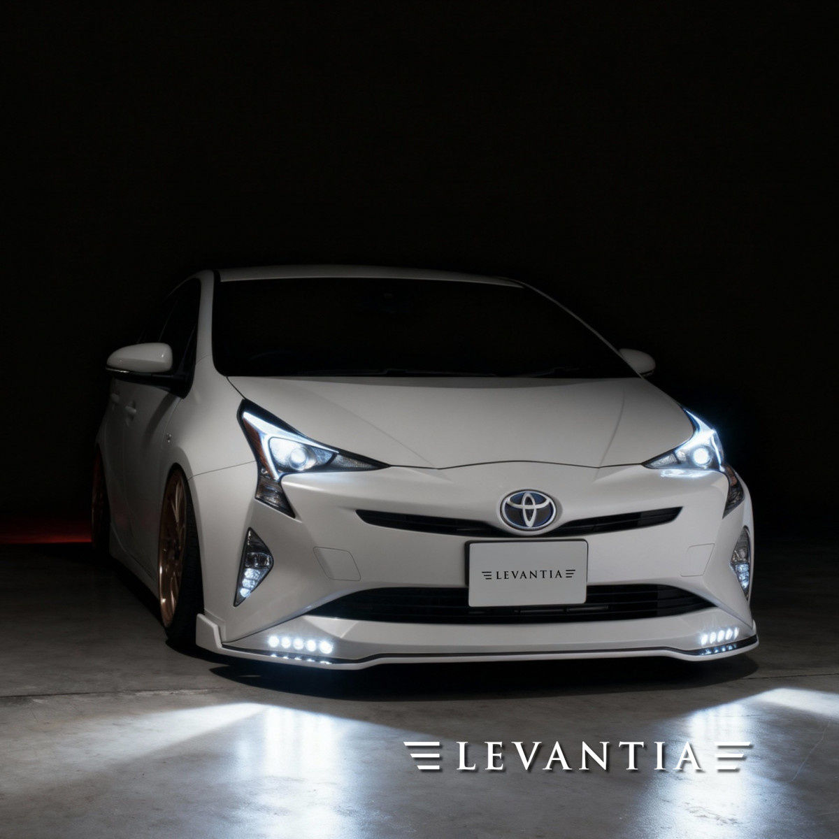 敬意を生む「造形」。LEVANTIAは50プリウスの純正ラインを尊重し、足し算ではなく“整える”ことで美しさを極めた。低く長いフロントが影を深め、LEDの粒が夜の表情を支配する。光が当たった瞬間、面の反射が一直線に揃い、ボディが一段低く見える。サイドは面を揃え、落ちた車高と足元が密度を上げる。リアはウイングと彫りの深いディフューザー、4本の焼け色テールで制限を解き放つ。余計な主張は抑えつつ、近づいた人だけがエッジの切れ味に息をのむ。走り出せば視線を奪い、止まれば品格で魅せる。指一本の隙間も許さない精密さを纏い、世界基準の圧倒的存在感へ。