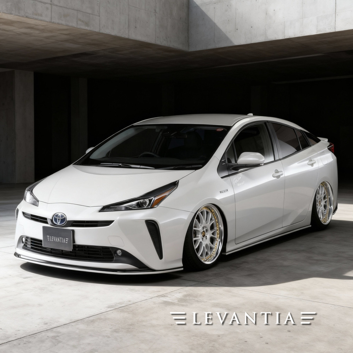 敬意を生む「造形」。LEVANTIAはプリウスの完成された面構成を壊さず、足すのではなく整える。フロントは薄く長いフラップで影を落とし、低さを“体感”させる。サイドは一直線のフラップがボディを引き締め、ホイールの存在感を際立てる。リアは立体的ディフューザーのフィンとアンダーフラップ、そして控えめなスポイラーで後ろ姿を重厚に完結。指一本の隙も許さない精密フィッティングで、最初からそうだったような均整へ。気づく人だけが頷く、静かな威厳をあなたのプリウスに。